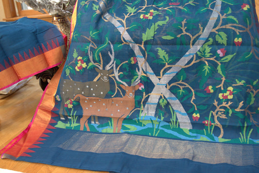 Blue Forest Scene Allover Ponduru Jamdani Sari